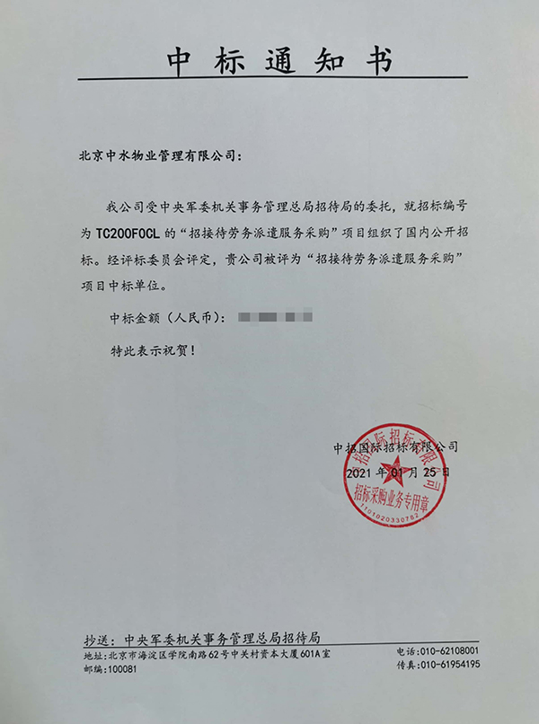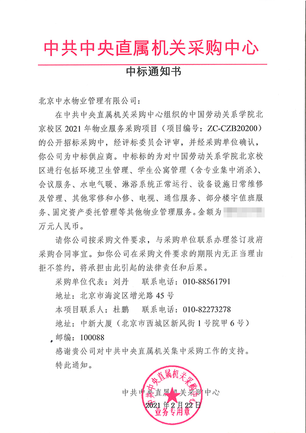 中国劳动关系学院北京校区2021年物业服务采购项目成功中标