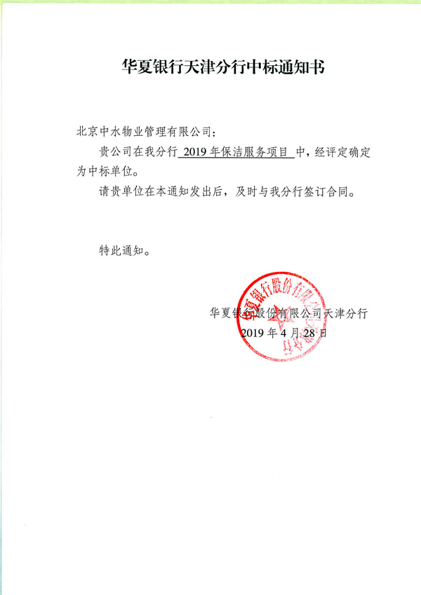 华夏银行天津分行保洁服务项目成功中标