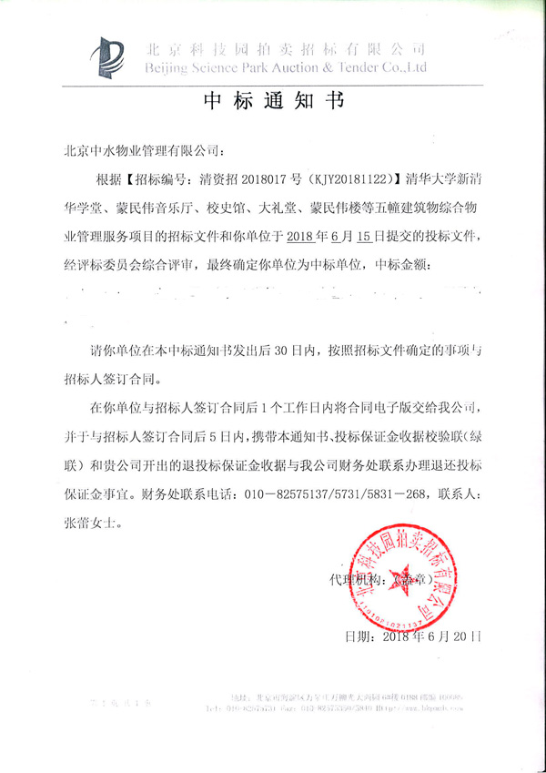 清华大学新清华学堂、蒙民伟音乐厅、校史馆、大礼堂、蒙民伟楼等五幢建筑物综合物业管理服务项目成功中标