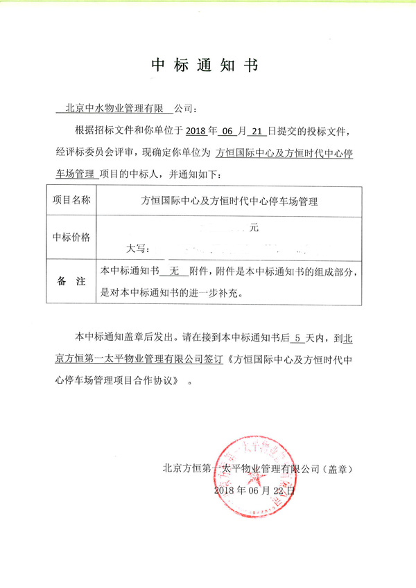 方恒国际中心及方恒时代中心停车场管理项目成功中标