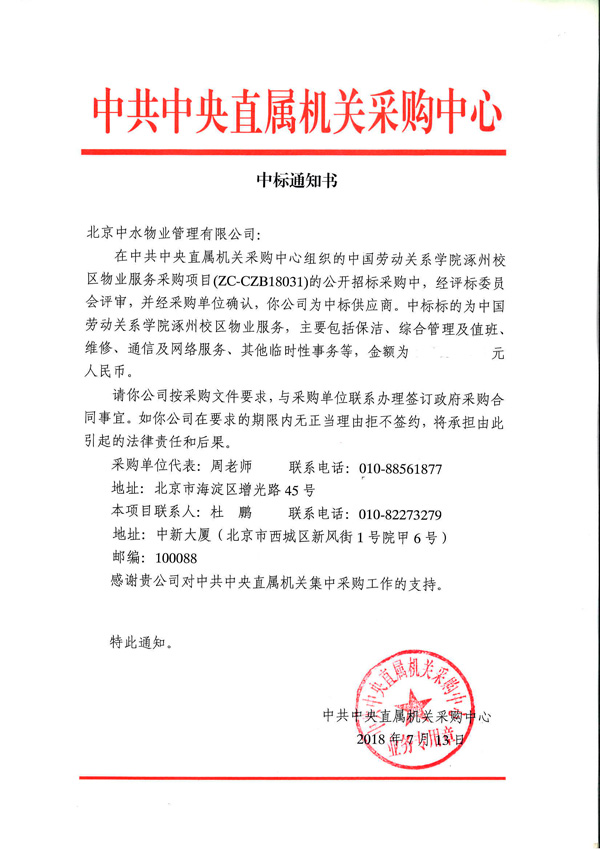 中国劳动关系学院涿州校区物业服务采购项目成功中标