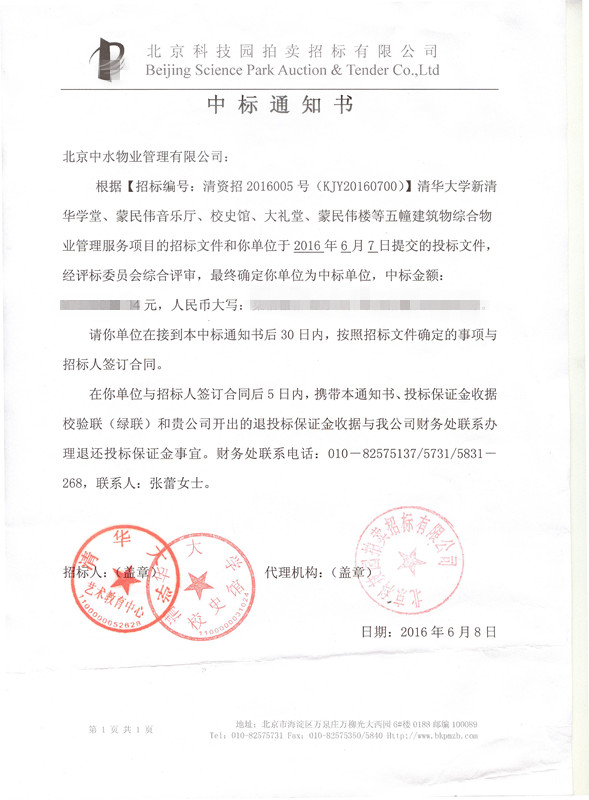 清华大学新清华学堂、蒙民伟音乐厅、校史馆、大礼堂、蒙民伟楼综合物业管理服务项目成功中标