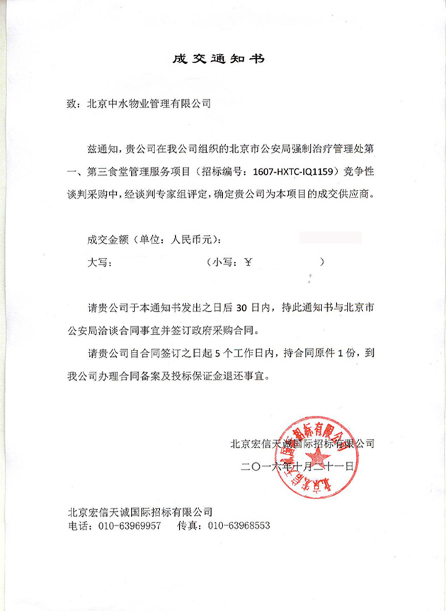 北京市公安局强制治疗管理处第一、第三食堂管理服务项目成功中标