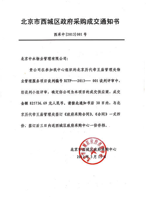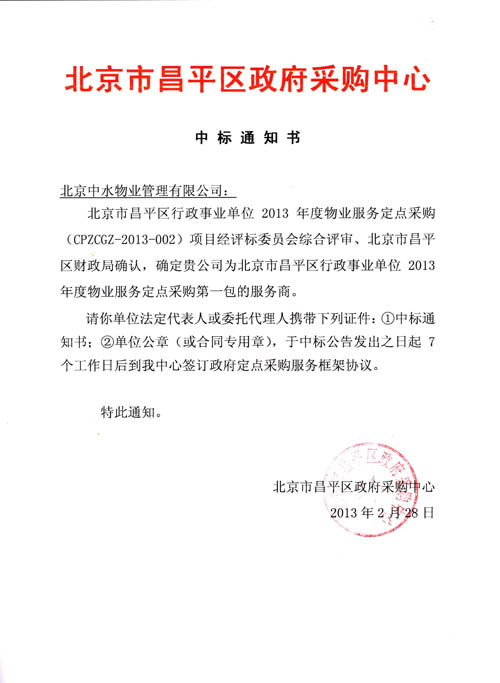 成功入围北京市昌平区行政事业单位2013年度物业服务定点采购供应商