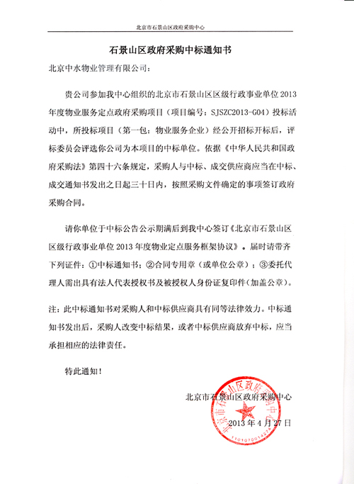 成功入围北京市石景山区区级行政事业单位2013年度物业服务定点供应商