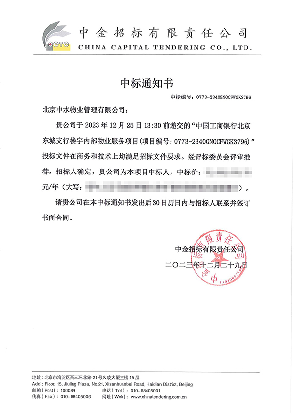 中水物业成功中标中国工商银行北京东城支行楼宇内部物业服务项目